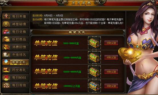 【活动说明】:每次单笔充值金额达到指定区间,即可领取1份对应的奖励!每次单笔充值只能领取1份奖励,如单笔充值100W元宝,也只能领取1个主宰单笔充值礼包!