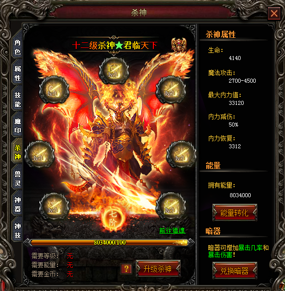 使用一定的能量,即可升级杀神。点击“能量转化”按钮进入转化界面,可将人物经验转化为能量,同时也可以使用道具能量丹获得能量。