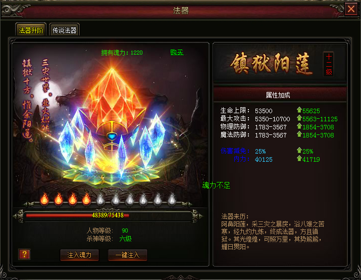 新增十二级法器——镇狱阳莲,更高级属性,华丽造型,你值得拥有!通过消耗魂力可进行升级,拥有唯一的伤害减免属性! 魂力可以通过使用魂力丹道具获得,击杀高级BOSS将会掉落魂力丹。