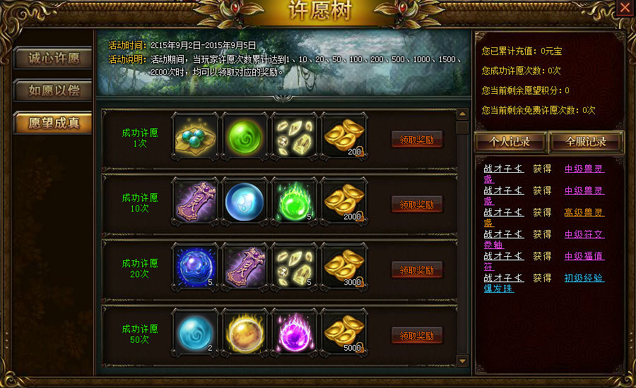 活动说明:活动期间,当玩家许愿次数累计达到1、10、20、50、100、200、500、1000、1500、2000次时,均可以领取相对应的奖励!