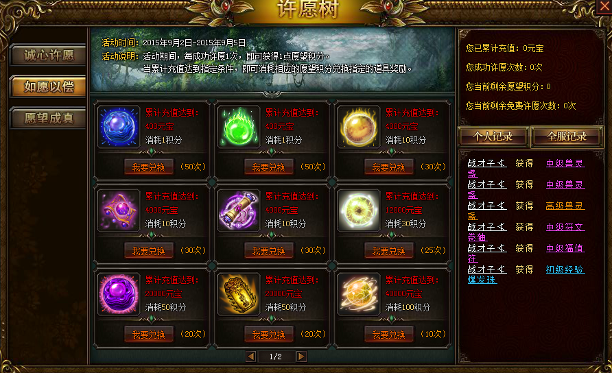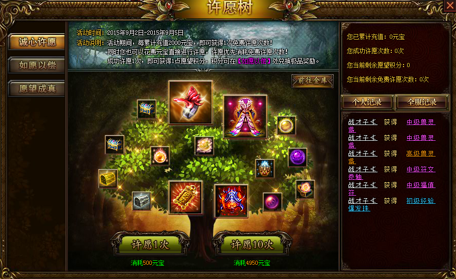 活动说明:活动期间,每累计充值2000元宝,即可获得1次免费许愿次数!同时您也可以花费元宝直接进行许愿,许愿优先消费免费许愿次数!成功许愿1次,即可获得1点许愿积分,积分可在【如愿以偿】处兑换极品奖励!