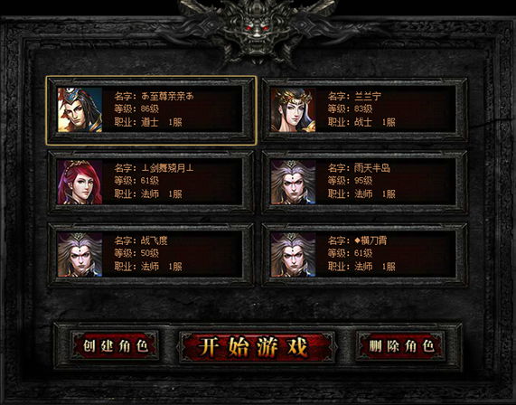 4) 进入游戏按钮:点击按钮以当前选中的角色进入游戏;