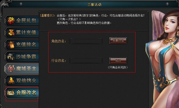 2、 合服后重名玩家可在合服活动面板中进入合服改名系统修改角色名