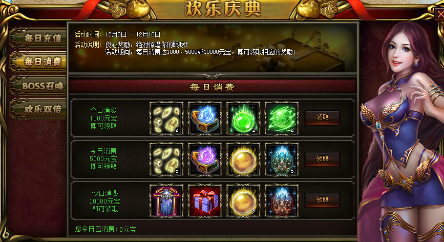 【活动内容】:活动期间,每日消费达到1000、5000、10000元宝,即可领取相应的奖励!