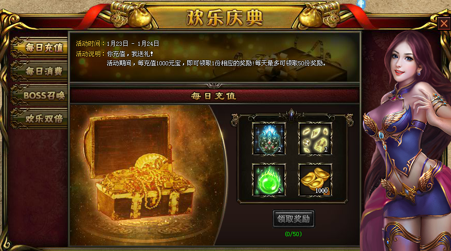 【活动内容】:活动期间,每充值1000元宝,即可领取1分相应的奖励!每天最多可领取50份奖励。