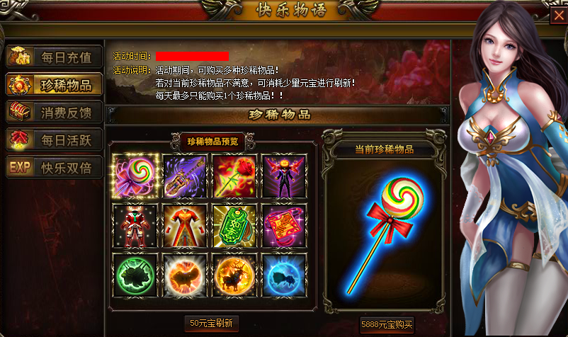 活动说明:活动期间,可购买多种珍稀物品!若对当前珍稀物品不满意,可消耗少量元宝进行刷新!每天最多只能购买1个珍稀物品!!