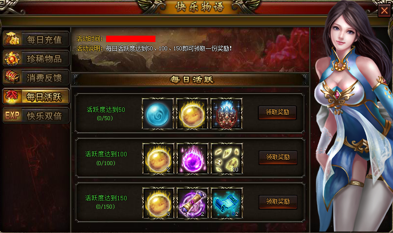 每日活跃 活动说明:每日活跃达到50、100、150即可领取一份奖励!