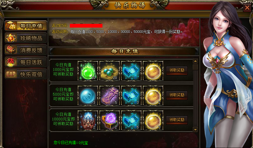 每日充值 活动说明:每日充值1000、5000、10000、30000、50000元宝,可获得一份奖励!