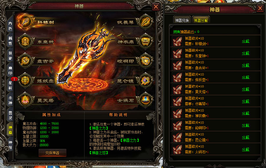 问世间,神器多为何愁?来七杀,为您解烦忧!全新推出神器分解功能,将多余的神器全部分解为神器碎片,然后再利用神器碎片合成自身所需的神器,实力大增,一举两得!激活任意神器,可获大量属性加成,且可激活神技【神器之力】;若激活所有神器,更可将神技【神器之力】升级为【神器之怒】。
