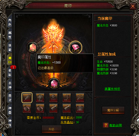 新增高级魔印——十一级魔印,升级即可获得大量属性加成,是您提升战力的不二选择!