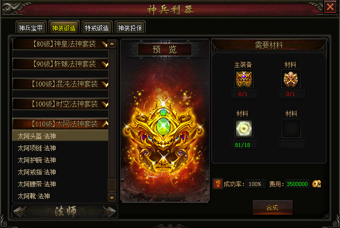 全新推出高级橙色太阿神装,更高的装备追求,更多的属性加成,绝对不容错过!在【神兵利器—神装锻造】界面,可以使用星芒魔珠和太阿紫色部件装备,将时空神装升级为太阿神装。