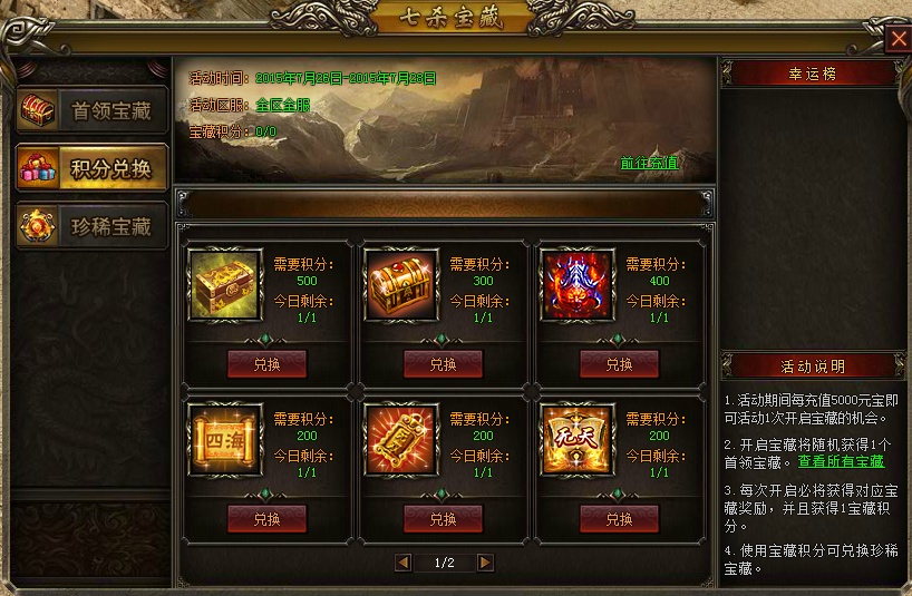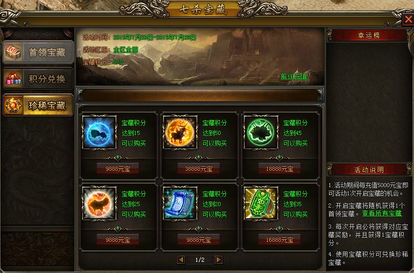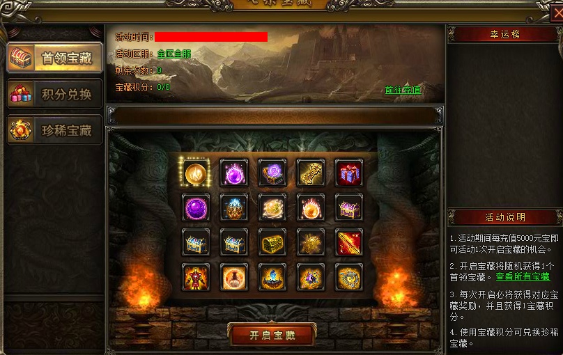 1. 活动期间每充值5000元宝即可活动1次开启宝藏的机会。