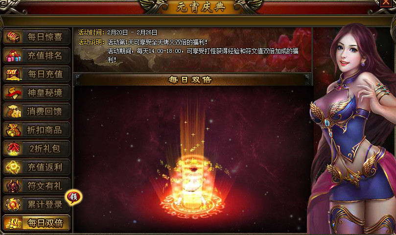 【活动内容】:活动期间,每天14:00 – 18:00,可享受打怪获得经验和符文值双倍加成的福利!活动第1天,更可享受全天烤火双倍!