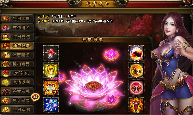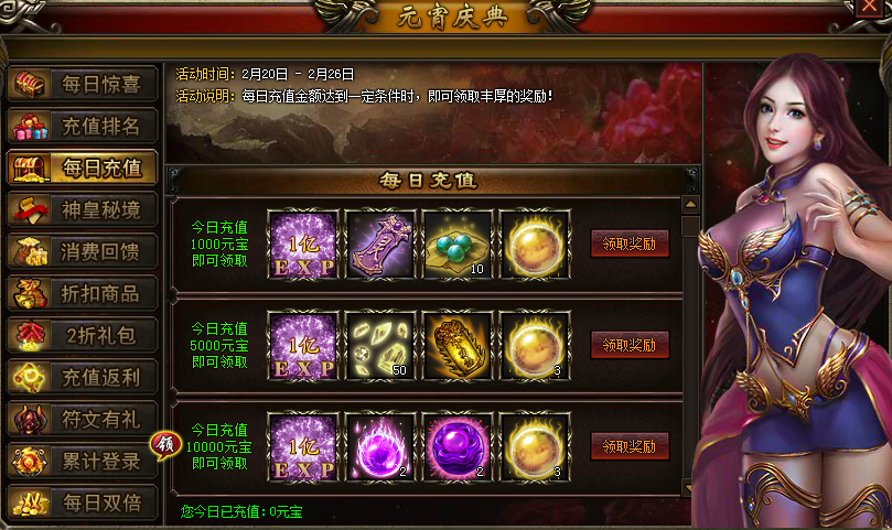 【活动说明】:每日充值金额达到一定条件时,可领取一份奖励。