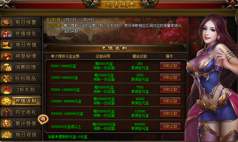 【活动说明】:单次提取元宝的金额达到一定条件时,即可领取相应区间对应的海量非绑定元宝!充值元宝与返利元宝同时提取!