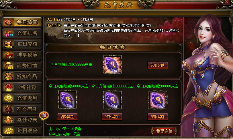 【活动内容】:每天充值满足条件即可领取百炼精钢礼盒和超级精钢礼盒;每天充值50W元宝更可获得绝世稀有的史诗精钢礼盒,开启百分百获得9-11级黑水晶之一!