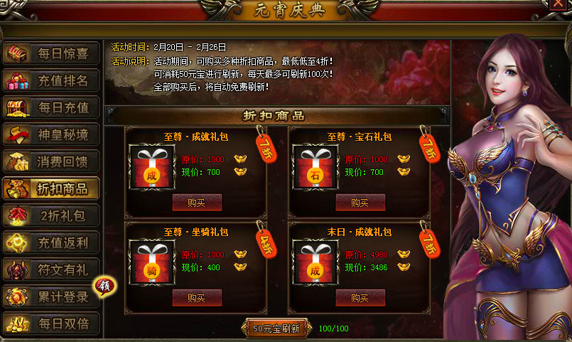 【活动说明】:活动期间,可购买多种折扣商品,全场最低低至4折!可消耗50元宝进行刷新,每天最多可刷新100次!全部购买后,将自动免费刷新!