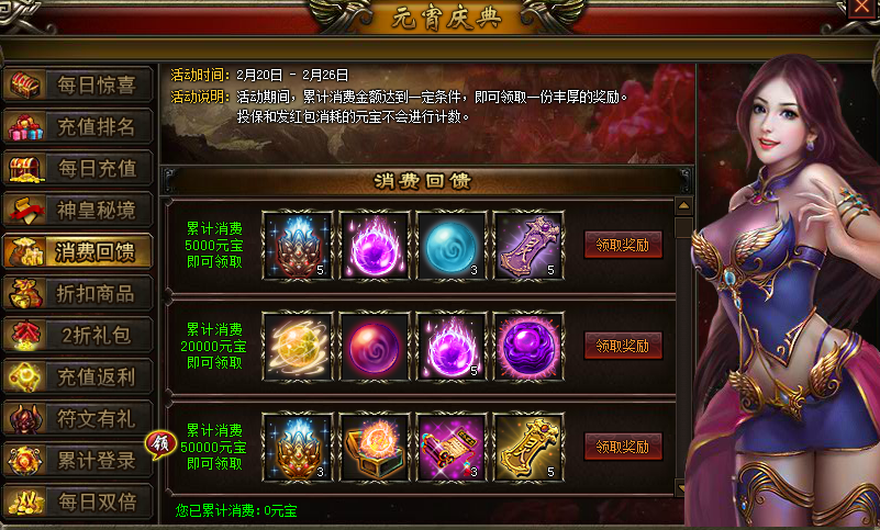 【活动说明】:活动期间,累积消费金额达到一定条件,即可领取一份丰厚的奖励!投保和发红包消耗的元宝不会进行计数。