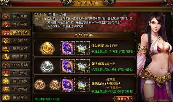 【活动说明】:活动期间,本服累计充值排名前5名便可获得丰厚奖励!排名第1更可获得11级黑水晶的奖励!累积充值300000元宝即可参与排名!活动结束后,奖励通过邮件发放!