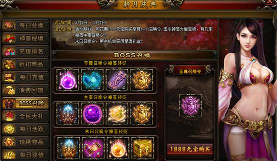 【活动说明】:活动期间,可花费1888元宝购买至尊boss召唤令,击杀掉落大量宝物,有几率掉落主宰召唤令!