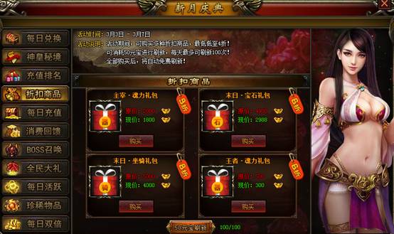 【活动说明】:活动期间,可购买多种折扣商品,全场最低低至4折!可消耗50元宝进行刷新,每天最多可刷新100次!全部购买后,将自动免费刷新!