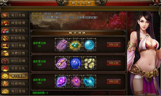 【活动时间】:当活跃度达到50、100、150后,可获得相对应的奖励!