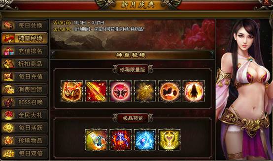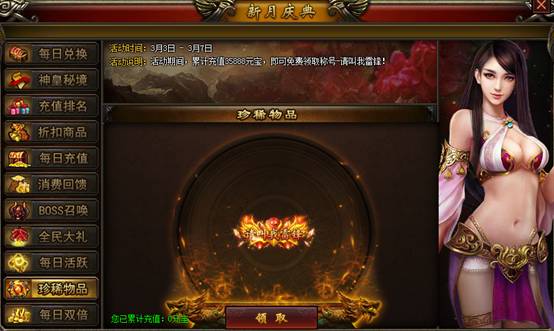 【活动说明】:活动期间,每充值100元宝,即可获得1点积分!可使用积分兑换多种物品!积分不清零!