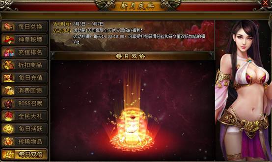 【活动内容】:活动期间,每天14:00 – 18:00,可享受打怪获得经验和符文值双倍加成的福利!活动第1天,更可享受全天烤火双倍!