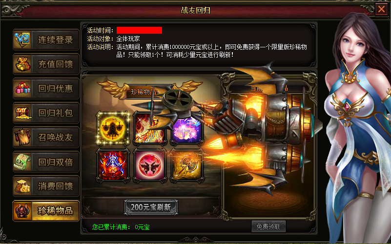 【活动说明】:活动期间,累计消费1000000或者以上,即可免费获得一个限量版珍稀物品!只能领取一个!可消耗少量元宝进行刷新!