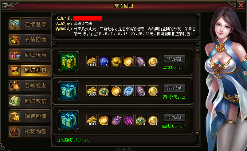 【活动说明】:外面风大雨大,只有七杀才是您的幸福港湾!活动期间登录的战友,如果您的离线时间达到3、5、7、10、15、20、25、30天,即可领取相应的礼包