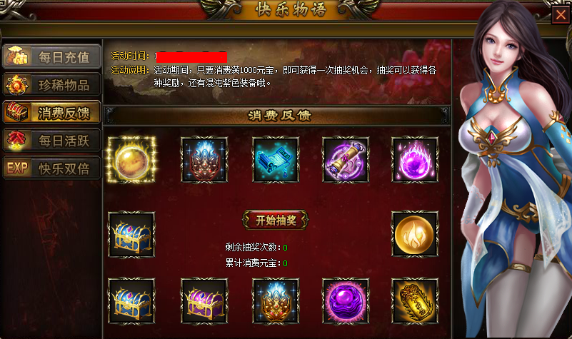 活动说明:只要消费满1000元宝,即可获得一次抽奖机会,抽奖可以获得各种奖励,还有混度紫色装备!