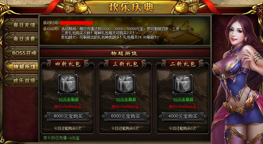 【活动内容】:活动期间,每日充值达到10000、30000、50000元宝,即可刷新四折、三折、二折礼包购买次数!每种礼包每天可购买2次!折扣越大,可刷新出的礼包种类越多!礼包每天24:00刷新!
