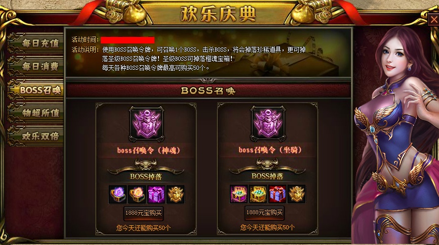 【活动内容】:使用BOSS召唤令牌,可召唤1个BOSS,击杀BOSS,将会掉落珍稀道具,更有几率掉落圣级BOSS召唤令!圣级BOSS有几率掉落橙魂宝箱!每天各种BOSS召唤令牌最高可购买50个!