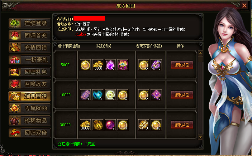 【活动说明】:活动期间,累计消费1000000或者以上,即可免费获得一个限量版珍稀物品!只能领取一个!可消耗少量元宝进行刷新!