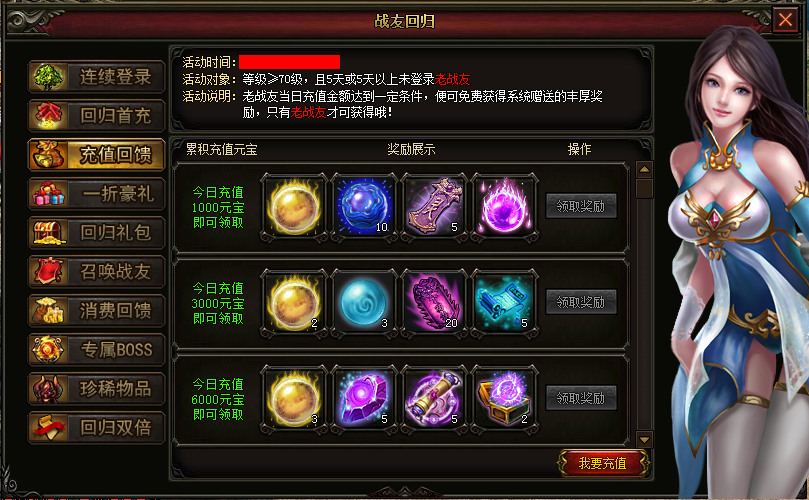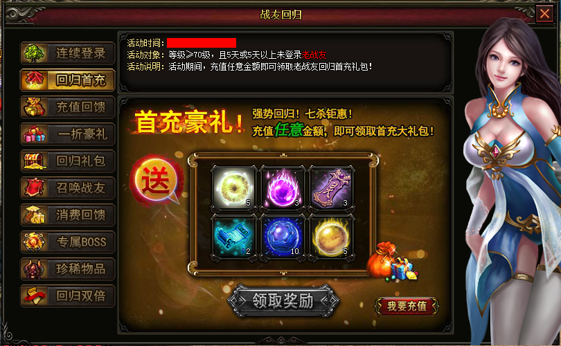 【活动说明】:活动期间,充值任意金额即可领取老战友回归首充礼包!