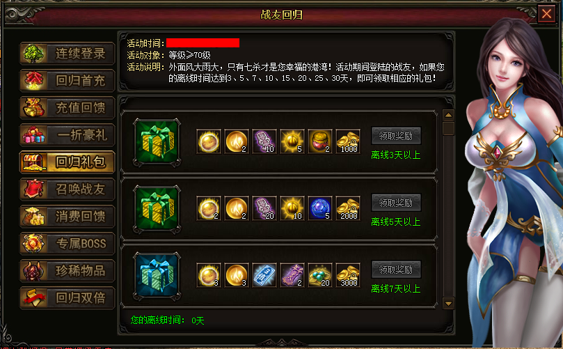【活动说明】:外面风大雨大,只有七杀才是您的幸福港湾!活动期间登录的战友,如果您的离线时间达到3、5、7、10、15、20、25、30天,即可领取相应的礼包