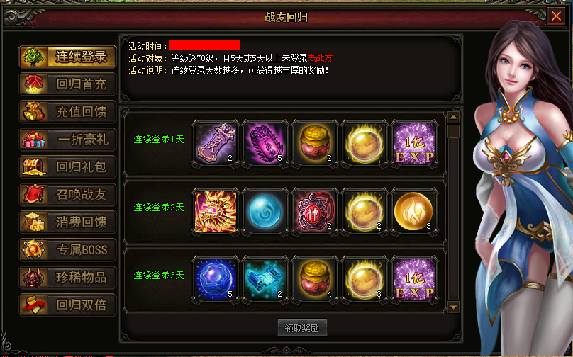 【活动说明】:连续登陆天数越多,可获得越丰厚的奖励