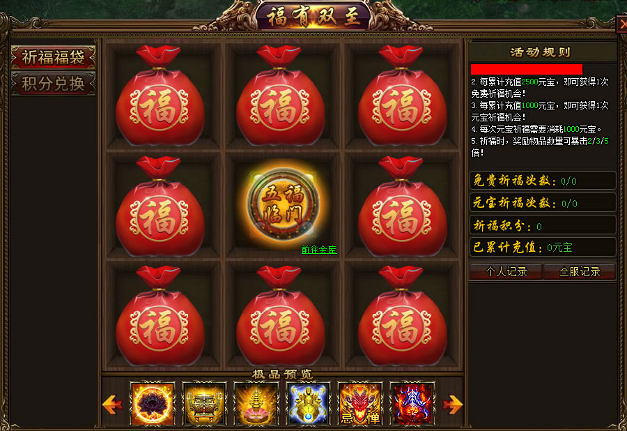 1、每累计充值2500元宝,即可获得1次免费祈福机会。