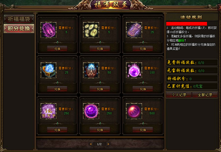 3、可消耗相应的祈福积分兑换指定的道具奖励。