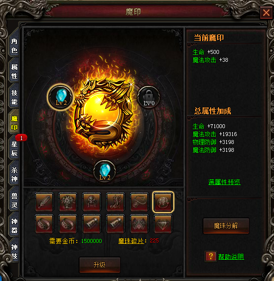 通过消耗魔珠碎片和永恒晶钻可以将魔印进行升级,魔珠碎片可通过击杀野外高级BOSS或者分解星芒魔珠获得,永恒晶钻可通过参与封印禁地活动击杀BOSS获得。