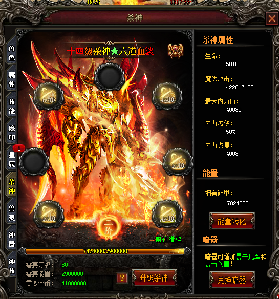 七杀杀隆重推出十四级杀神,强大的属性,攻守兼备,是您提升战力的上上之选,同时保证您在PK中,更有优势。 使用一定的能量,即可升级杀神。点击“能量转化”按钮进入转化界面,可将人物经验转化为能量,同时也可以使用道具能量丹获得能量。