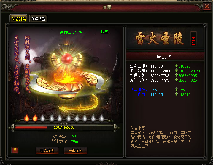 新增高级法器——雷火圣陵,更高级的属性,更华丽的造型,您值得拥有!通过消耗魂力可进行升级,拥有唯一的伤害减免属性! 魂力可以通过使用魂力丹道具获得,击杀高级BOSS也会掉落魂力丹。