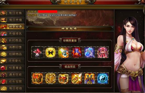 【活动说明】:活动期间,每充值100元宝,即可获得1点积分!可使用积分兑换多种物品!积分不清零!