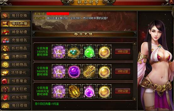 【活动说明】:每日充值金额达到一定条件时,可领取一份奖励。