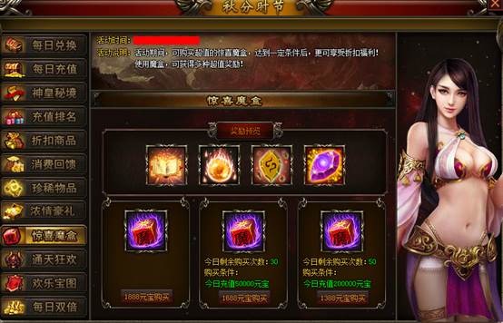 【活动说明】:活动期间,可购买超值的惊喜魔盒,达到一定条件后,更可享受折扣福利!使用魔盒,可获得多种超值奖励!