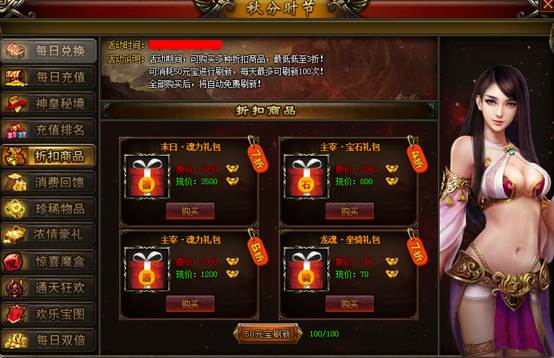 【活动说明】:活动期间,可购买多种折扣商品,全场最低低至4折!可消耗50元宝进行刷新,每天最多可刷新100次!全部购买后,将自动免费刷新!