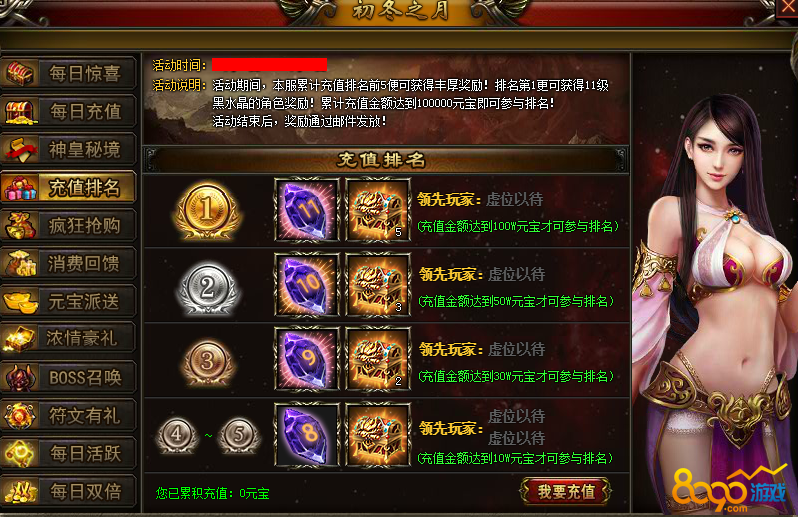 【活动说明】:活动期间,本服累计充值排名前5名便可获得丰厚奖励!排名第1更可获得11级黑水晶的奖励!累积充值100000元宝即可参与排名!活动结束后,奖励通过邮件发放!
