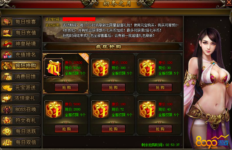 【活动说明】:活动期间,每3小时刷新出超值礼包!使用元宝购买,购买可享受2-4折折扣,并有机会获得七杀币加成!最多可获得2倍七杀币。全部售完,会有新一批超值礼包刷新!
