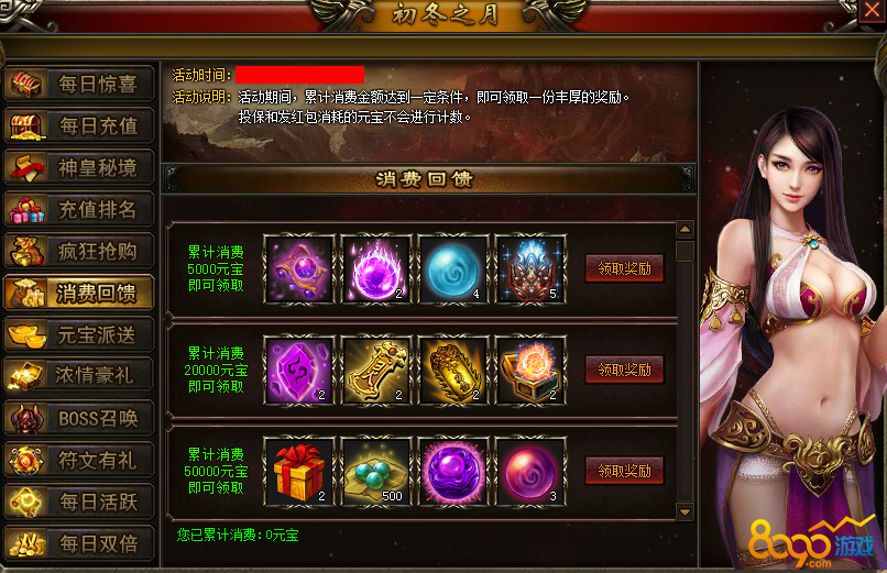 【活动说明】:活动期间,累积消费金额达到一定条件,即可领取一份丰厚的奖励!投保和发红包消耗的元宝不会进行计数。