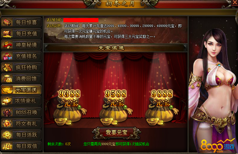 【活动说明】:活动期间,每天累计充值达9999、49999、99999、299999、499999元宝,即可获得一次元宝赚元宝的机会。每次需要消耗的数量不等的元宝,可获得三大元宝奖励之一。